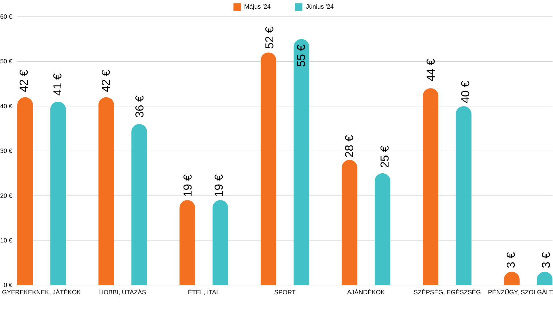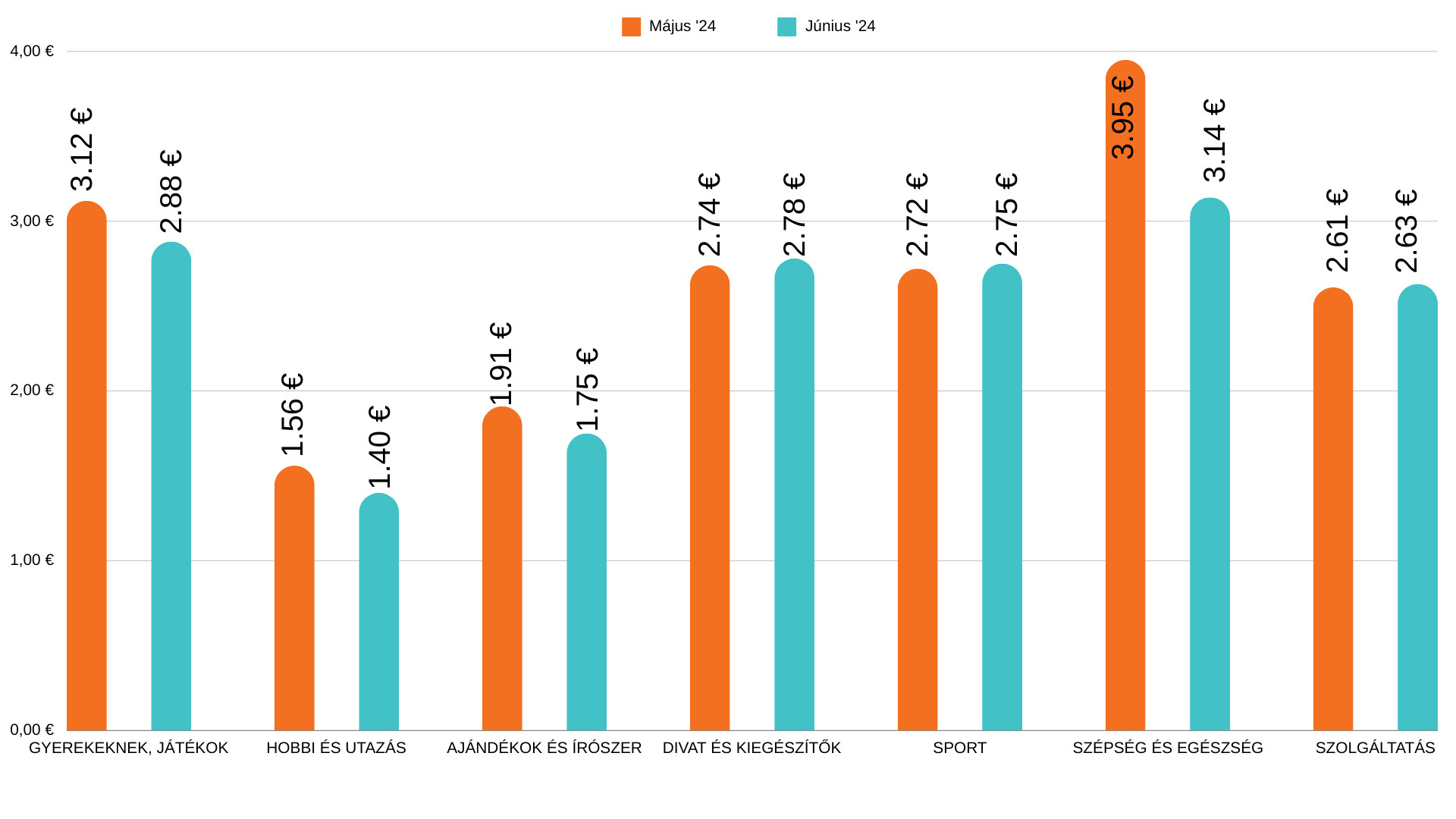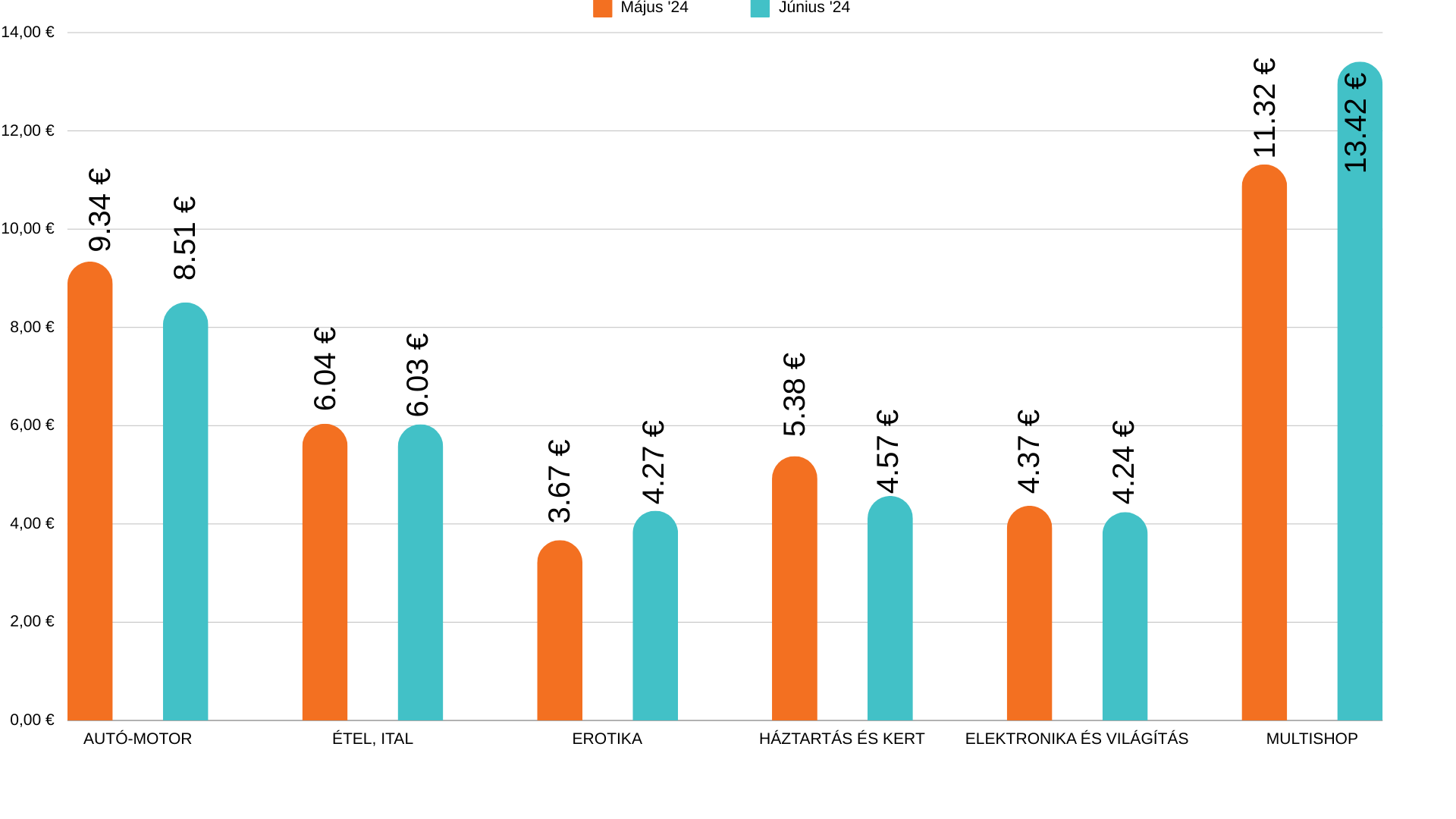 Ugyan a konverziók száma néhány esetben nőtt, a rendelések átlagos értékéről ugyanez már nem mondható el. A kosárérték az Erotika kategóriában emelkedett, ahol a Szeresdmagad.hu kampány javuló teljesítménye is közrejátszik. A rendelések átlagos értéke nőtt még a Multishop szektorban is, méghozzá 6 euróval. Őt követi a Sport kategória 3 eurós emelkedéssel.