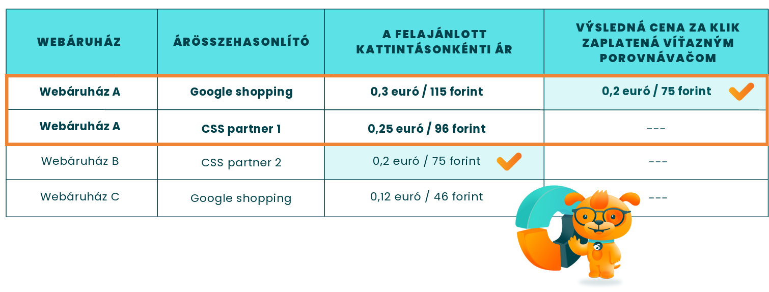 Az ugyanarra a webshopra vonatkozó ajánlatokat a Google nem tekinti konkurens ajánlatnak, és nem helyezi őket egymás ellen az aukción sem, függetlenül attól, hogy hány forrásból származnak. Ha a Te ajánlatod nyer, a kattintásonkénti költség továbbra is a konkurencia második legmagasabb ajánlatán alapul majd – nem a te CSS-partnered ajánlatán.
