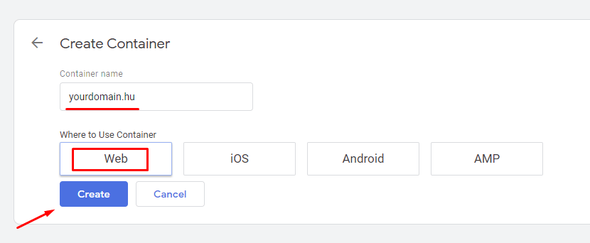- Hozzon létre fiókot az https://tagmanager.google.com/#/home oldalon és hozzon létre egy „container”-t a webshop számára