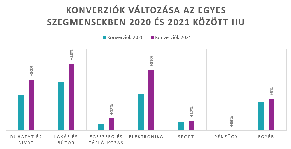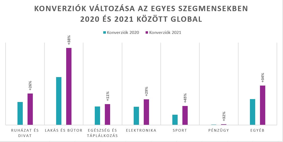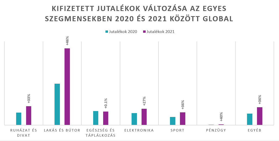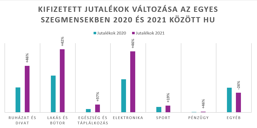 A legnagyobb növekedést konverziók és jutalékok szerint az Egészség és Táplálkozás szegmens mutatja, 47 százalékkal több konverzióval és 52 százalékkal több kifizetett jutalékkal. Az Elektronika szegmens is nagyon nagyot ugrott egy év alatt, 39 százalékkal több konverzió mellett 46 százalékkal több jutalékot is hozott partnereinknek. A Ruházat és Divat, valamint a Lakás és Bútor szegmensek is nagyon jól teljesítettek, ráadásul ezekben a szegmensekben a jutalékok jelentősen jobban növekedtek mint a konverzók, ami arra utal, hogy a vevők nem csak többet vásároltak, de magasabb értékben is. A Sport szegmens nem teljesített annyira jól mint globálisan, ami abból adódik, hogy a magyar piacon sajnos még kevés hirdetőnk van ebben a szegmensben. Az Egyéb kategóriában pedig ugyan megnőtt a konverziók száma, a kifizetett jutalékok viszont csökkentek, ami arra utal, hogy a megrendelt áru értéke összesen kevesebb volt 2021-ben, mint 2020-ban.