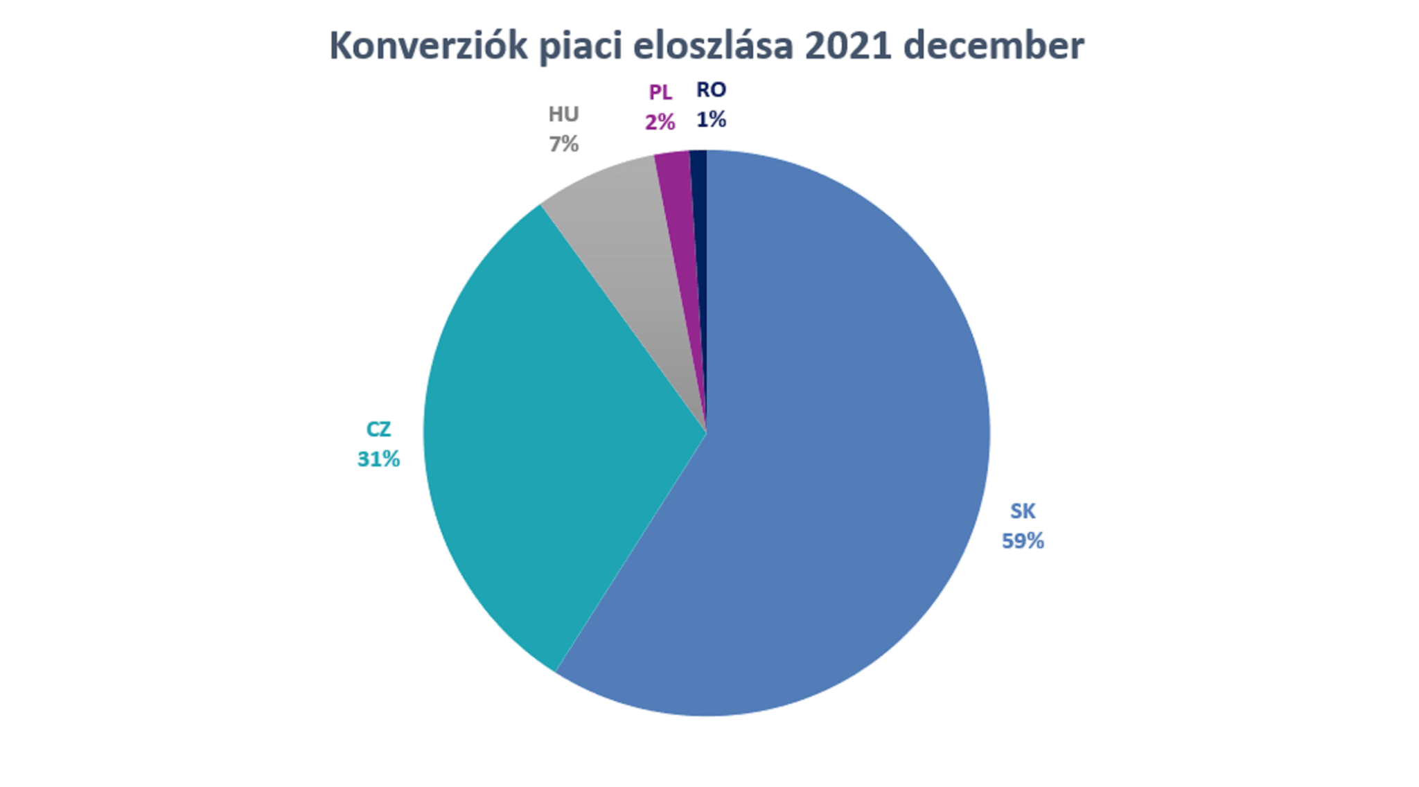 Decemberben a szlovák piacon jegyeztük a legtöbb konverziót, 59 százalékot. Ezt a cseh piac követte 31 százalékkal, majd a magyar piac 7 százalékkal, a lengyel 2 százalékkal és a román 1 százalékkal.