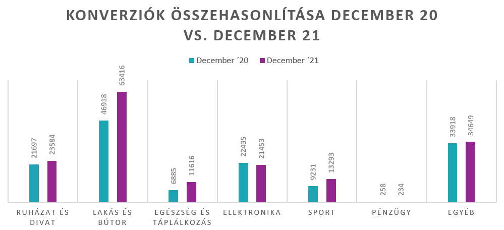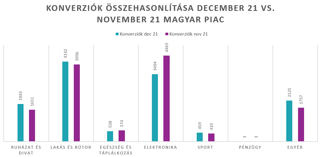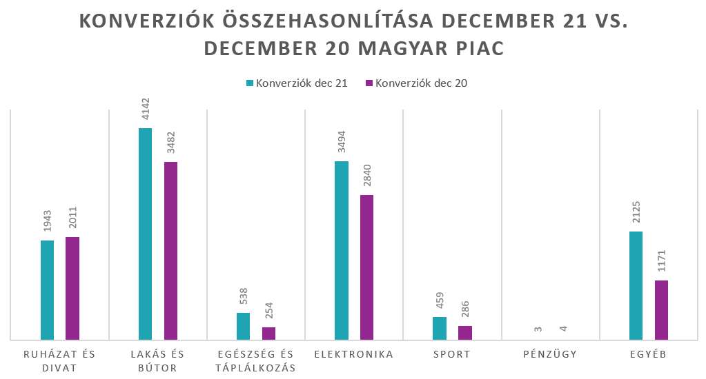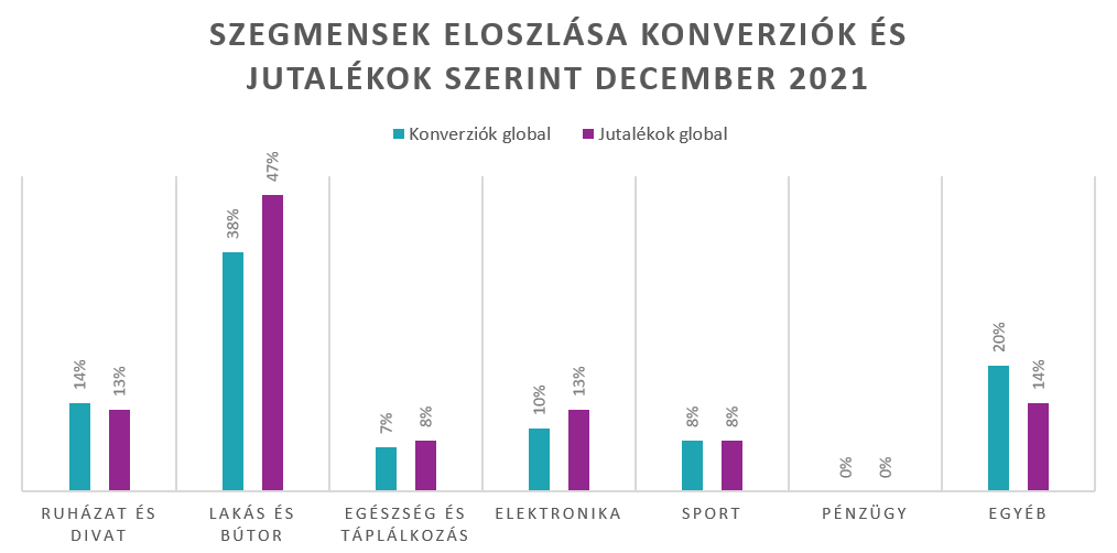 Az összes piacot együttvéve konverziók és kifizetett jutalékok szerint is a Lakás és Bútor kategória teljesített a legjobban, követve az Egyéb és a Ruházat és Divat kategóriával. Novemberrel szemben volt némi változás konverziók és kifizetett jutalékok szerint is. Mind két paraméterben javultak a Ruházat és Divat, az Egyéb és a Sport kategóriák. Az Egészség és Táplálkozás kategóriában csökkent a konverziók aránya 2 százalékkal novemberhez képest, a jutalékok aránya viszont 1 százalékkal nőtt. Ez arra vezethető vissza, hogy decemberben az emberek nagyobb értékben, átlagban 3500 Ft-tal többért vásároltak.