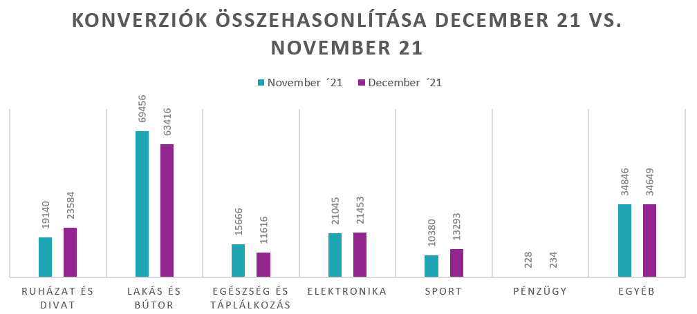 Novemberben a Lakás és Bútor és az Egészség és Táplálkozás szegmensek jelentősen jobban teljesítettek mint decemberben, valamint az Egyéb kategória is kicsivel jobb volt. Decemberben viszont erősebbek voltak a Ruházat és Divat, a Sport és az Elektronika szegmensek.