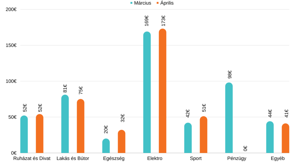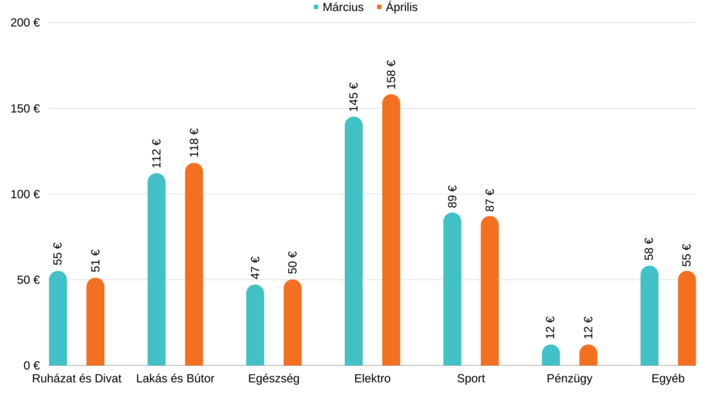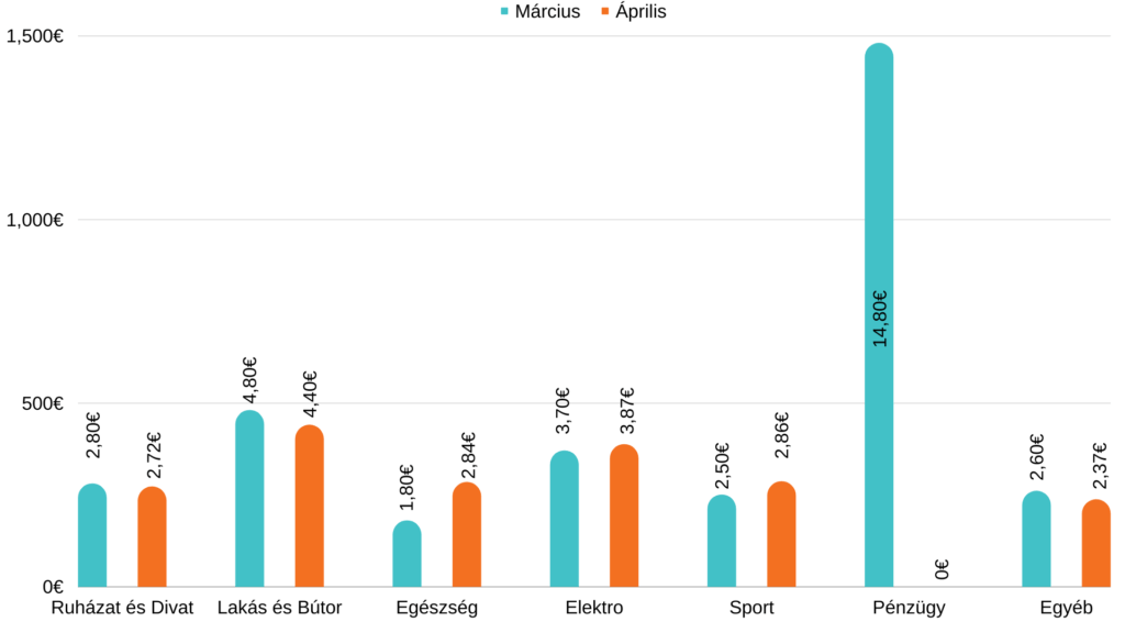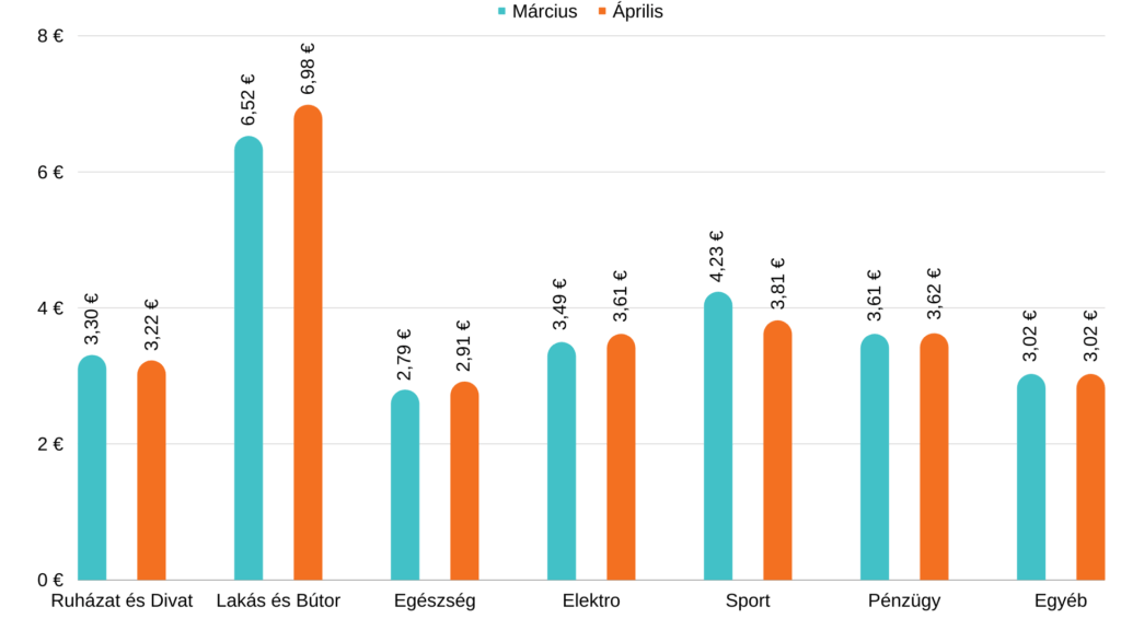 Ugyan globálisan nézve áprilisban kevesebb konverziót regisztráltunk az Elektronika szegmensben, mint márciusban, a rendelések átlagos értéke jelentősen megnőtt 145 euróról 158 euróra. Még pozitívabb, hogy a Lakás és Bútor szegmensben az emberek nem csak többet, de nagyobb értékben is rendeltek.