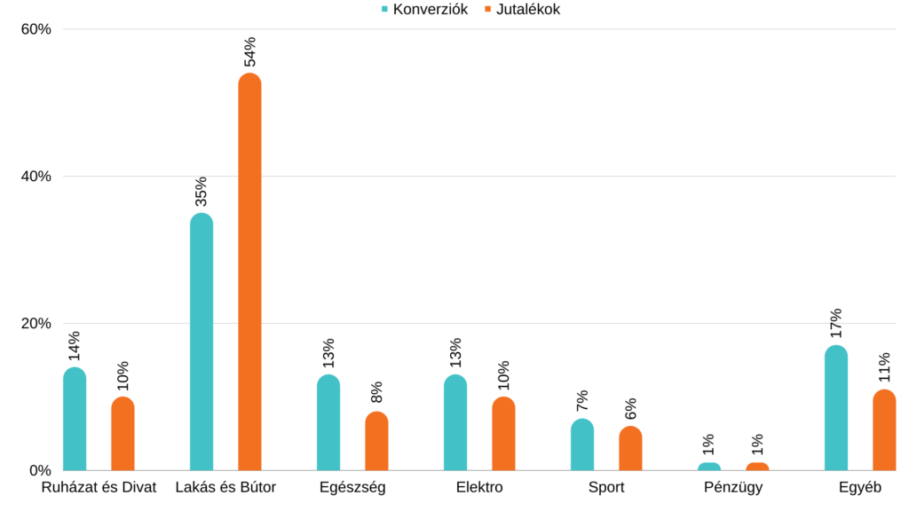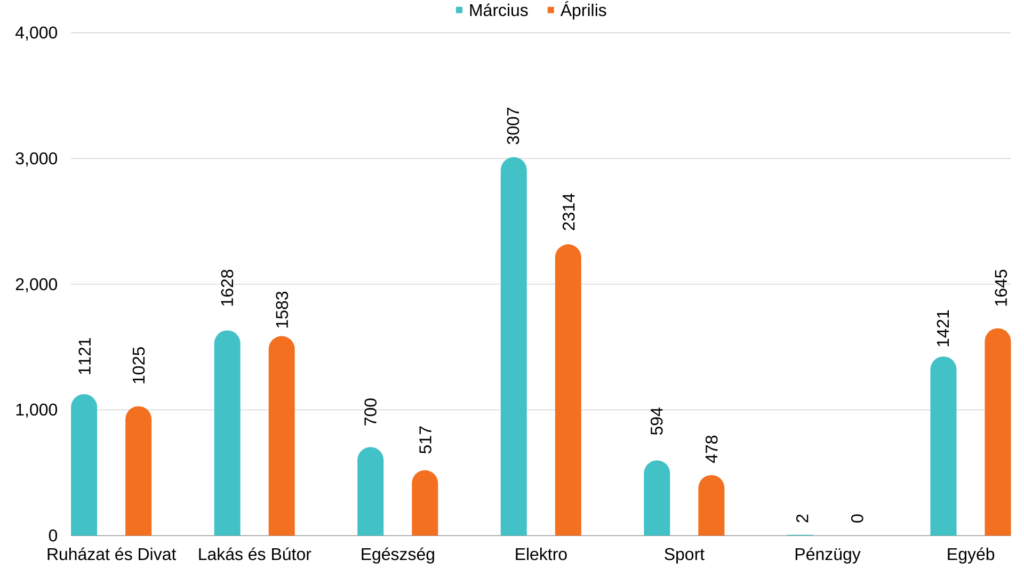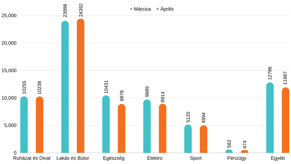 Márciushoz képest áprilisban kicsit több konverziót regisztráltunk a Lakás és Bútor és a Ruházat és Divat szegmensben, a többiben pedig valamennyivel csökkent a konverziók száma.