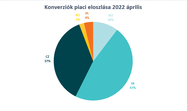 A konverziók piaci eloszlása áprilisban márciushoz képest egy kicsit változott, a magyar piac ezúttal a konverziók 10 százalékát hozta a március 11 százalék helyett, valamint egy százalékkal csökkent a szlovák piacon is a konverziók aránya, viszont egy-egy százalékkal megnőtt a lengyel és a cseh piacon regisztrált konverziók aránya.
