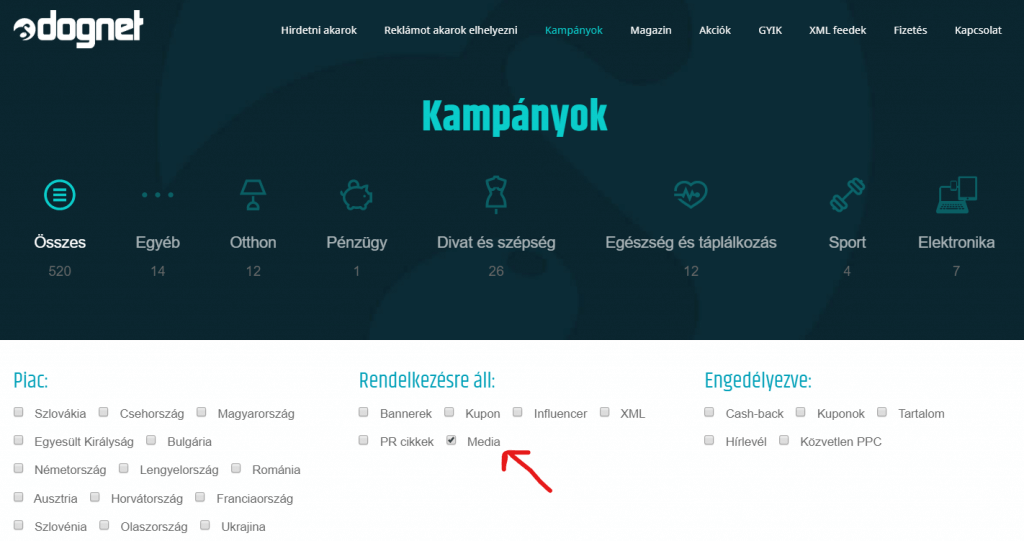 Azt, hogy melyik kampányunknál érhető el médiakampány, a Kampányok menüpont alatt találjátok meg, a szűrő résznél kattintsátok be a “Media” részt.