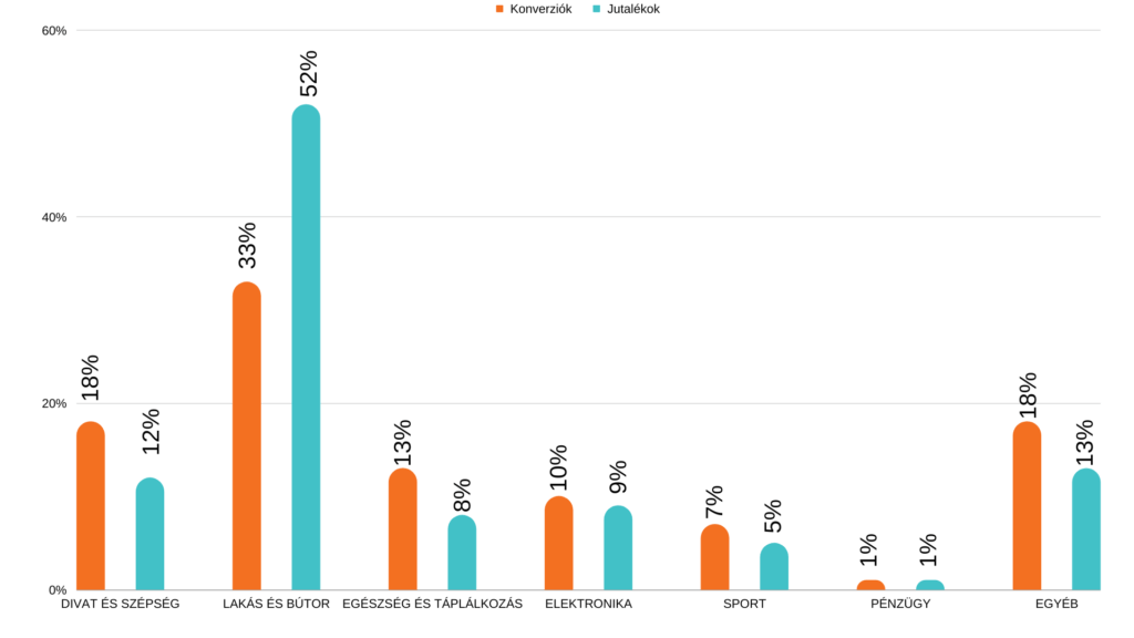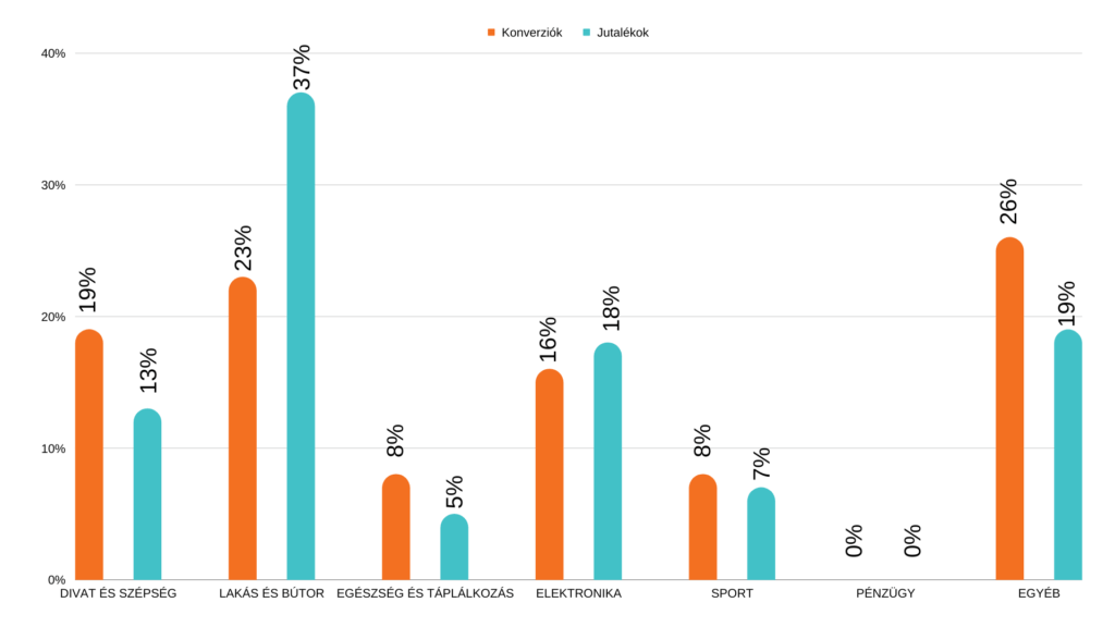 A magyar piacon a legtöbb konverziót az Egyéb szegmensben regisztráltuk, innen eredt a jutalékok 19 százaléka. A második legtöbb konverzió a Lakás és Bútor szegmensből jött, viszont ebből a szegmensből eredt az összes jutalék több mint harmada, 37 százalék. A magyar piacon is érvényes, hogy a legtöbb jutalék konverzióként ebből a szegmensből jön. Ezt az Elektronika, a Divat és Szépség, a Sport és az Egészség és Táplálkozás szegmensek követték. A Pénzügy szegmensben augusztusban nem regisztráltunk egy konverziót sem.