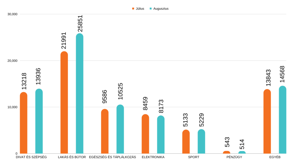 Az Elektronika és Pénzügy szegmensek kivételével minden szegmensben több konverziót regisztráltunk augusztusban, mint júliusban. A Lakás és Bútor szegmensben jelentősen növekedett a konverziók száma. Ezt a trendet látva óvatosan optimisták lehetünk, hogy talán kezd megerősödni a vásárlók vásárlási ereje.